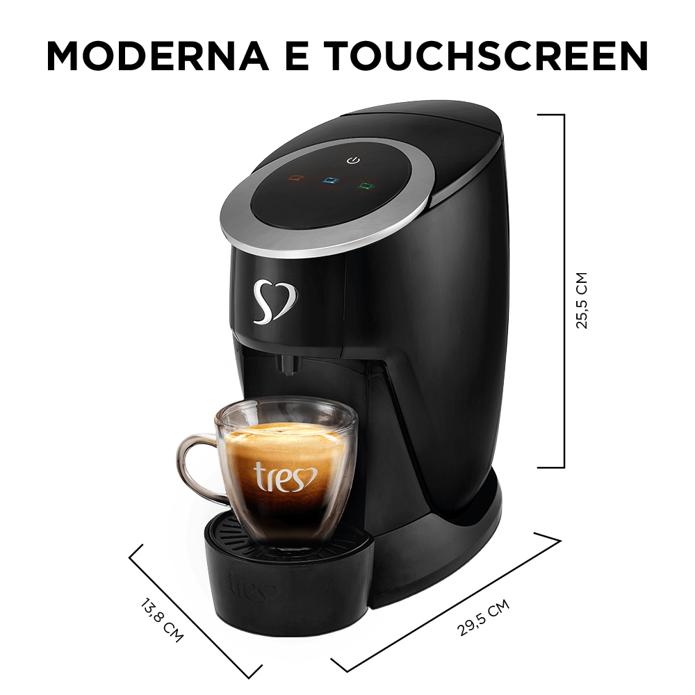 A Cafeteira de Espresso e Multibebidas Automática Touch TRES 3 Corações é moderna, elegante, compacta e touchscreen. Com um Design moderno e elegante, valoriza qualquer ambiente da sua casa, principalmente o cantinho do café. O destaque fica por conta do painel touchscreen, novidade neste modelo, cujos comandos são sensíveis ao toque. Além disso, a TOUCH é silenciosa, possui um compartimento interno para até 4 cápsulas usadas e sistema multipressão.